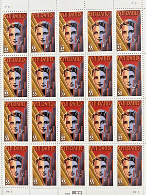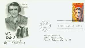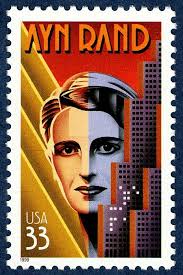 (The 33-cent Ayn Rand commemorative stamp, issued on April 22, 1999, features an art deco-style illustration by Nicholas Gaetano. The design shows a portrait of Ayn Rand with the Manhattan skyline partially obscuring the right side of her face, a nod to her memory of seeing the skyline for the first time. The stamp was part of the American Literary Arts Series)